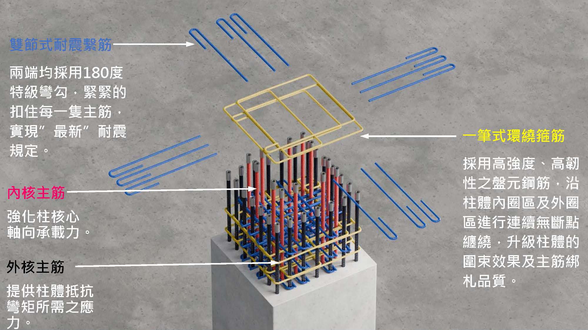 - 雙核心環繞箍筋:採用高強度、高韌性之盤元鋼筋,沿柱體內圈區及外圈區進行連續無斷點纏繞,升級柱體的圍束效果及主筋綁札品質。